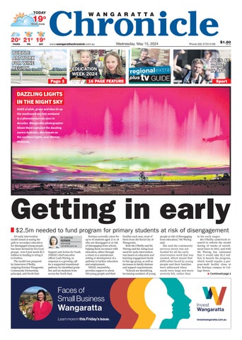 $1.80 INC. GST www.wangarattachronicle.com.au Phone (03) 5723 0100 Wednesday, May 15, 2024 TODAY Mostly cloudy THURS FRI SAT 19 19o 20 20o 21 21o 19 19o Page 3 BUBBLE ARTWORK FOR WINE WINE REGION JOE’S AT HOME IN AFL 16 PAGE FEATURE EDUCATION WEEK 2024 Sport Getting in early $2.5m needed to fund program for primary students at risk of disengagement AN l i t ti B i tl t f f ili h t f l t i k f di i i th l t $pgpygg DAZZLING LIGHTS IN THE NIGHT SKY BY SIMONE KERWIN skerwin@ nemedia.com.au