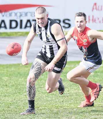 CHASE IS ON: Callum Moore leads his opponent to the ball. PHOTOS: Kurt Hickling GOAL SNEAK: Abe Ankers booted five in Wangaratta’s win over Wodonga Raiders.