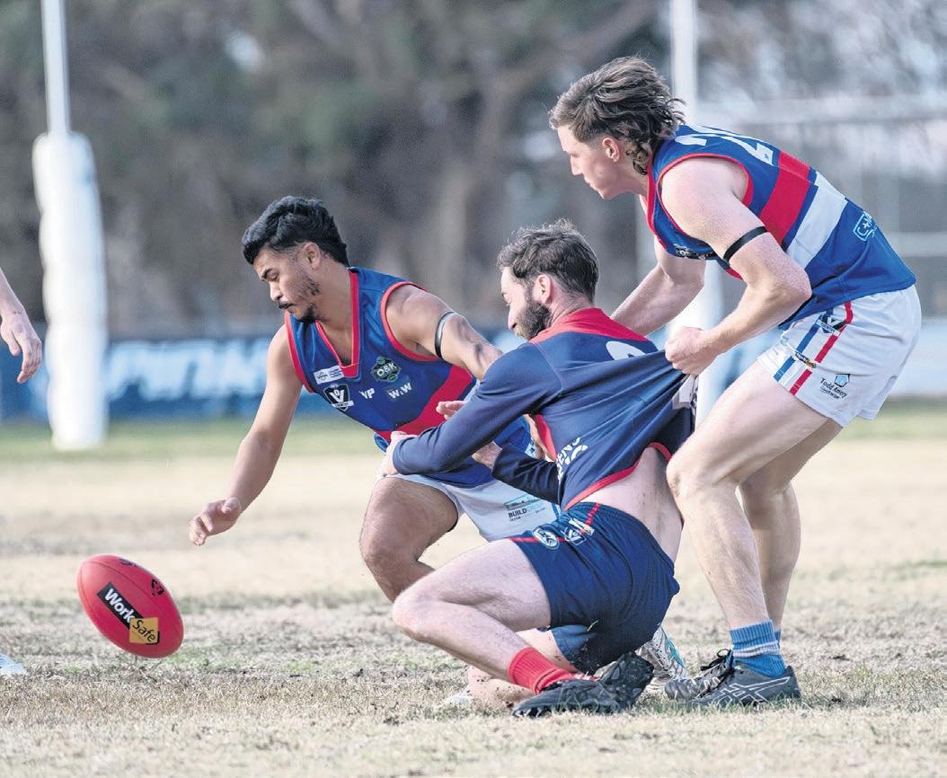 ROVED: Jalees Khan swoops on the loose ball after it spills from Tyler Dunn and Angus Beck in Milawa’s 70-point win over Tarrawingee.