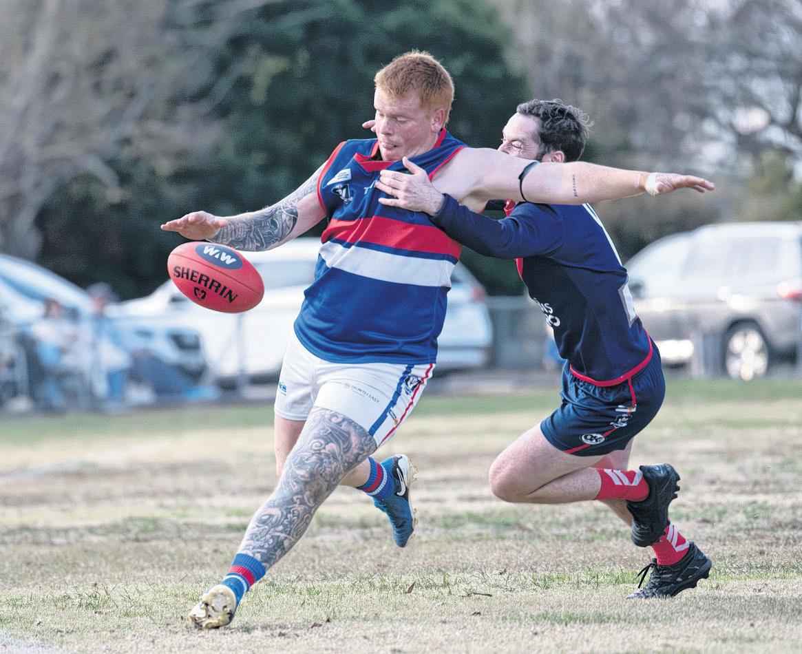 MILAWA’S Daniel Bihun wraps up Scott Thompson in the Demons’ 70-point win over Tarrawingee.
