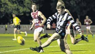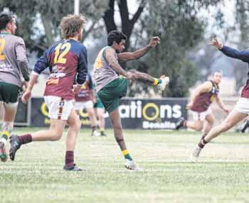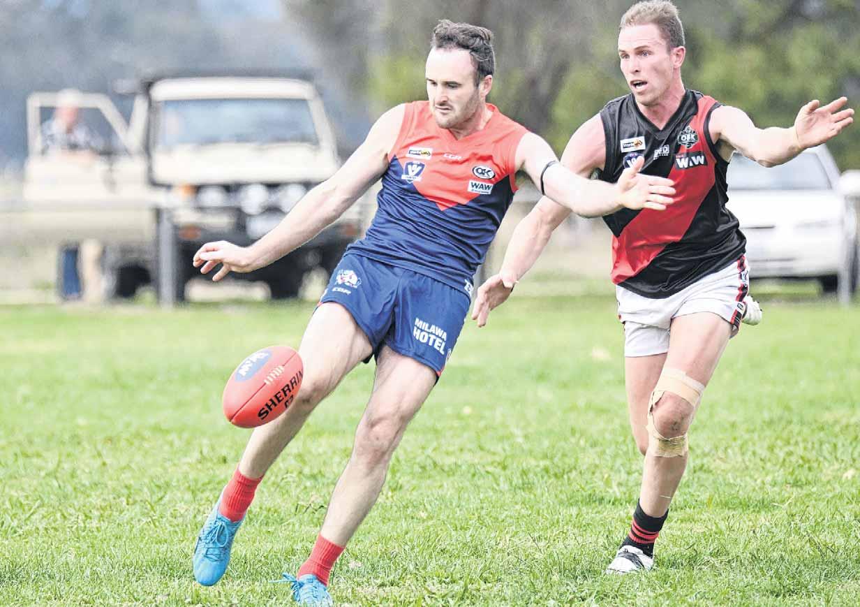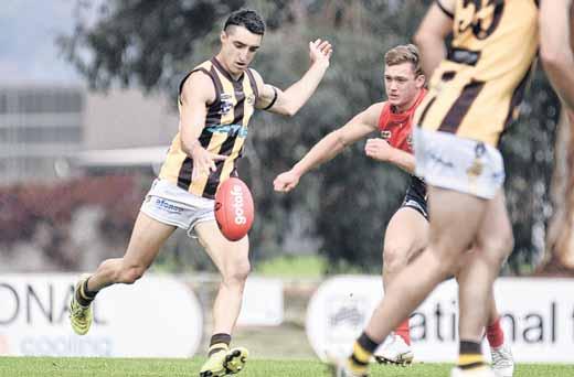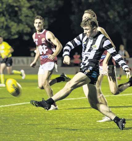 LAUNCHED: Darcy Melksham gets a kick away in Wangaratta’s loss to Wodonga on Saturday night. PHOTOS: Marc Bongers