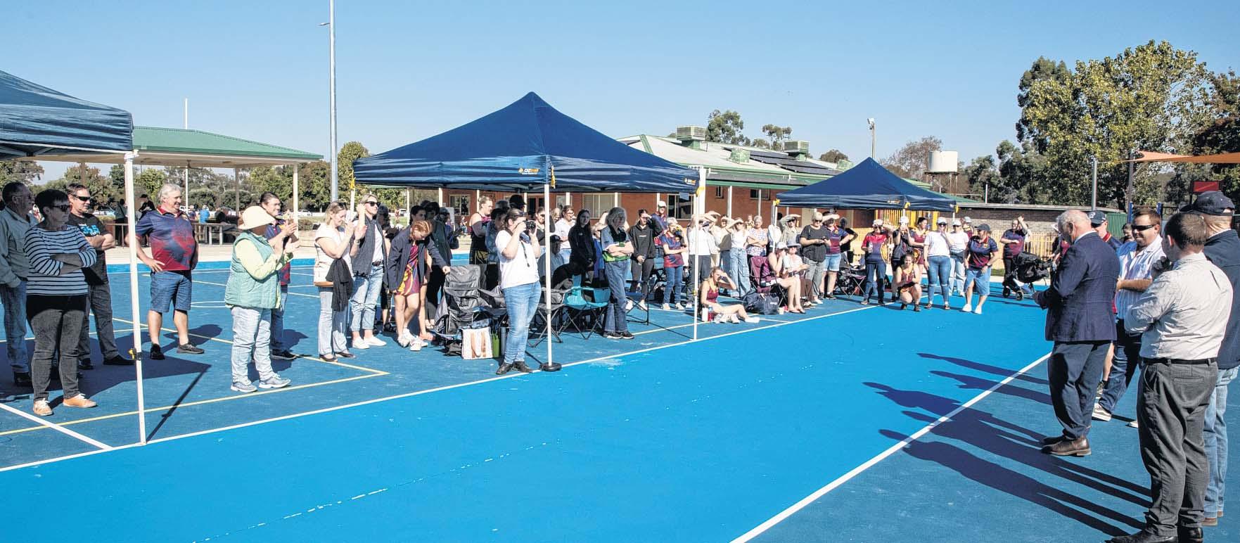 Whorouly Football Netball Club unveiled their new netball courts on Saturday with (L-R) Whorouly FNC netball operations manager Stacey Harris, Whorouly Recreation Reserve Committee secretary Ruth Costenaro, Cr David Fuller, Whorouly Recreation Reserve Committee president Trent Newton, Cr Harry Bussell, Whorouly FNC president Eddie Costenaro, Cr Harvey Benton present.