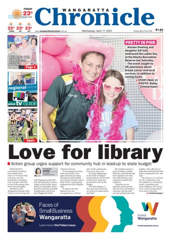 Learn more in this Friday’s issue. $1.80 INC. GST www.wangarattachronicle.com.au Phone (03) 5723 0100 Wednesday, April 17, 2024 TODAY Fog then sunny then sunny THURS FRI SAT 23 23o 22 22o 23 23o 23 23o Page