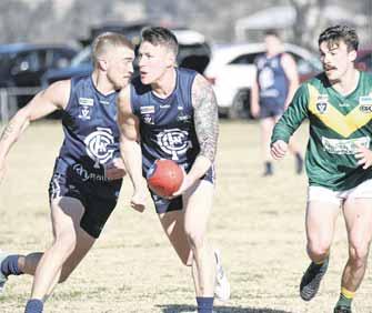 GOOD TACKLE: Zac Bladon is forced to dish off a handball or get run down in North Wangaratta’s 80 point win over the Lions.