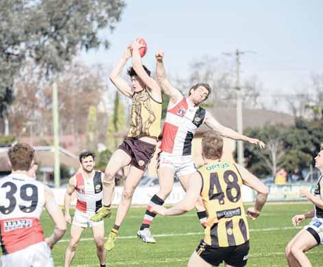 WANGARATTA Rovers’ coach Sam Murray fends his Myrtleford opponent off in his side’s 42-point win at WJ Findlay Oval on Saturday.