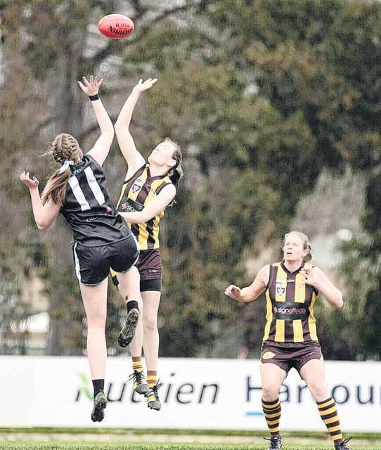 UP IN THE AIR: Bianca Mulqueen contests the ruck, as Celia Piesse watches on.BARRIER: Emma Gosbell blocks for Jess Maddy.