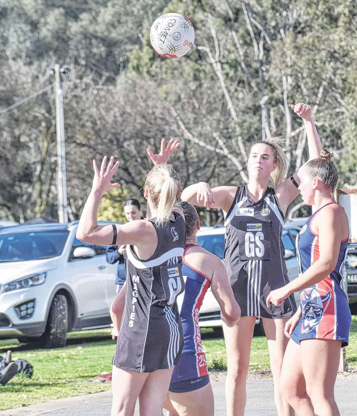 WANGARATTA A grade netballers got their revenge against Wodonga Raiders at Norm Minns Oval on Saturday.TheMagpies went down to the Raiders by 12 goals in round seven but got their pay back on the weekend with a 27-goal thrashing. An 18-goal to eight penultimate term set the Magpies up for a barnstorming 61-34 smashing.AmyByrne was unstoppable through the front two thirds of the court, netting 18 goals to go with numerous amounts of assists to shooter Georgia Clark who ended the day with 47 Wangaratta’sgoals.