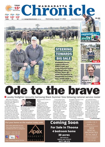 NEW RENTAL PROPERTIES AVAILABLE LOOKING FOR A RENTAL??? CALL KAREN 0400 500 681 TRAVIS 0477 138 372 KAREN 0400 500 681 www.wangarattachronicle.com.auPhone (03) 5723 0100Wednesday, August 17, 2022 TODAYTODAY Cloud increasingCloud THURSTHURS FRIFRI SATSAT 1515o 1616o 1313o 1313o Laceby firefighter recounts harrowing Black Summer fires following national service medalyggg Ode to the bravePage5 F prizep$3000$Fiona’siona’s3000rize tv GUIDE plus Sport Moran’s a a team man man $1.50 INC. GST23 0100 BOWMANS Forest cattle FULLWangarattaunderofbigCraigRobertproducers(left)andFergusonexpectthingswhen230theirsteersgothehammerinonFriday.STORYPAGE3PHOTO:KurtHicklingSTEERINGTOWARDSBIGSALE