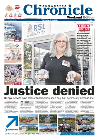 L I F E S T Y L E R E S I D E N T I A L C O M M E R C I A L & I N D U S T R I A L R U R A L C O M M E R C I A L M A N A G E M E N T R E S I D E N T I A L M A N A G E M E N T B U S I N E S S B R O K E R I N G C L E A R I N G S A L E S 23 Baker St, Wangaratta | Ph: (03) 5722 2663 | garrynash.com.au | Integrity, Experience & Results for over 43 yrs Living independently Know the signs TODAY Fog then then sunny 22 22o SAT 23 23o SUN 24 24o MON 25 25o TUE 24 24o www.wangarattachronicle.com.au Weekend Edition $1.80 INC. GST Phone (03) 5723 0100 FRIDAY, April 19, 2024 Sport Inside Page 3 BELLA WAITS ON WORLD C’SHIPS SELECTION EXPLOSIVE DEVICE IN ROWAN ST EX-SERVICE woman