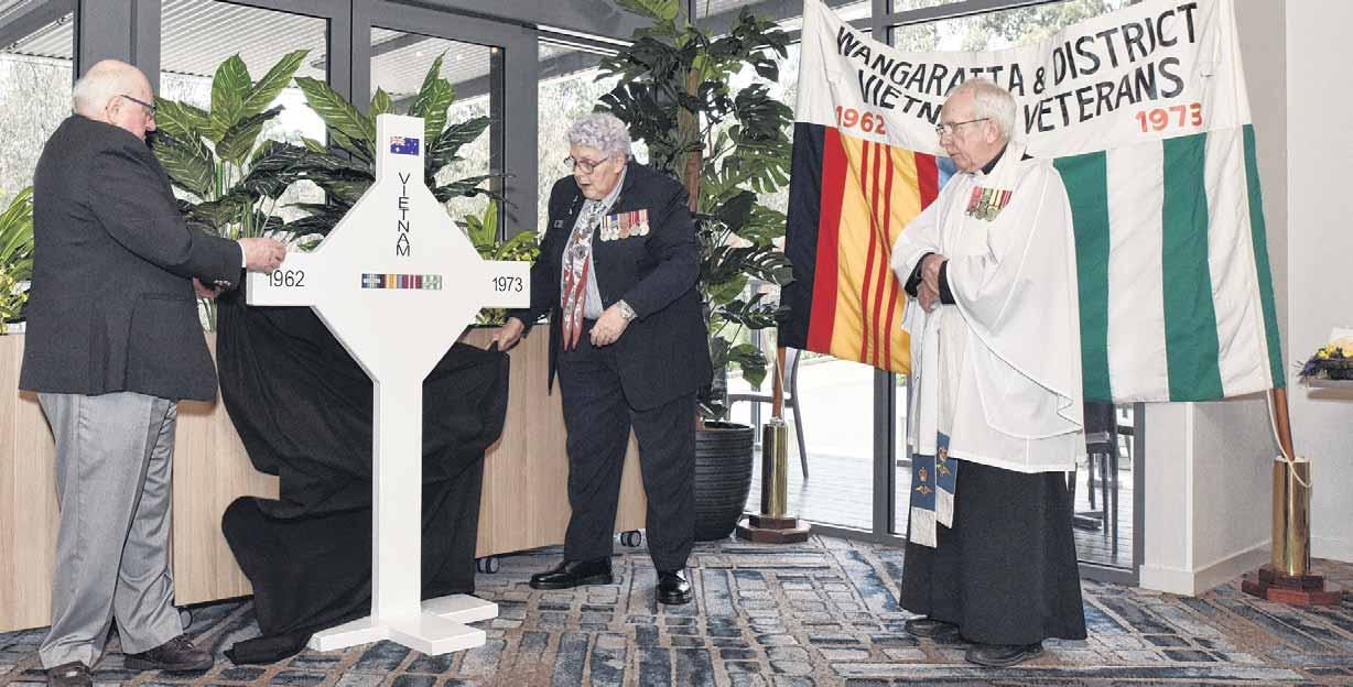 MORE than 50 people attended yesterday’s special service at the Wangaratta RSL subbranch to mark Vietnam Veterans’ Day. The service was punctuated by the unveiling of a symbolic cross, made by members of the Wangaratta Mens’ Shed, to be a constant reminder of those who served. Guest speaker Terry Bennett (RAAOC retired), Liz Rouse-Salmon and Reverend Michael Pullar are pictured unveiling the cross.