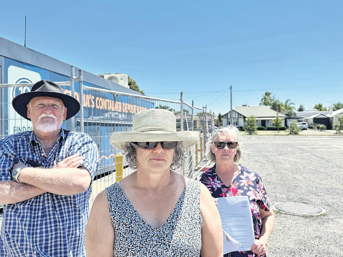 UP IN ARMS: Residents adjacent to the Wareena Park car park Graeme Crowley (le ), Karen Adcock and Sharon Gannon have objected the positioning of the newly installed reverse vending machine, citing a lack of transparency in its placement. PHOTO: Bailey Zimmermann