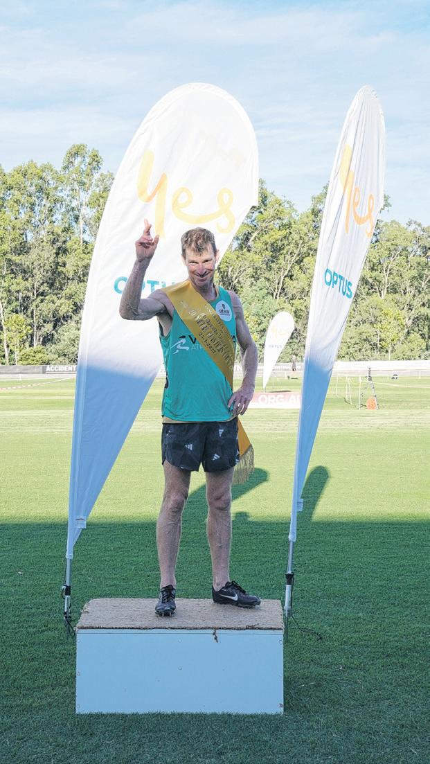MOTORING HOME: Wangaratta Sports Club secretary Paul Hughes powers through the finish line in Wangaratta Masters 120m fina and salutes the crowd on the presentation dais.