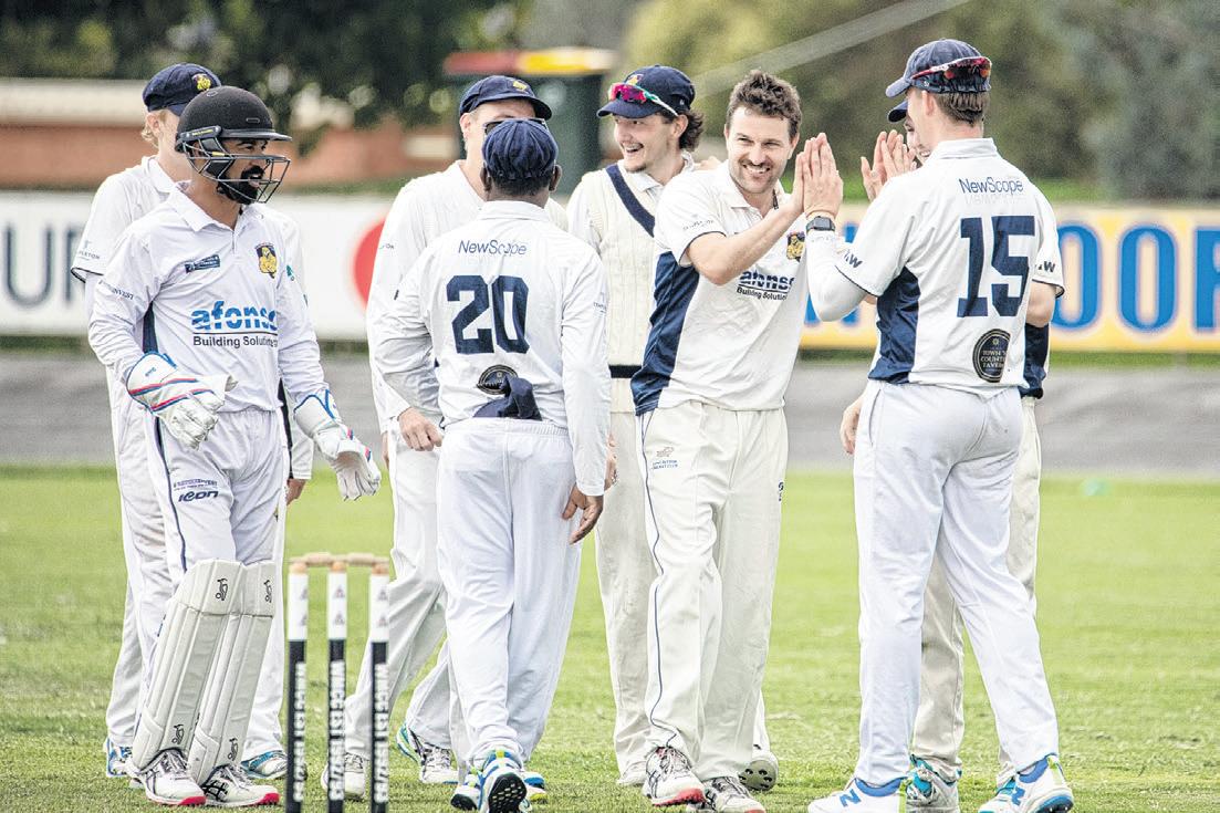 Jarryd Wallace was run out for ve, Brady Bartlett trapped James Thewlis LBW for seven, and Jacob Schona nger took care of Dean Simmons (12) and Oliver Andrew ( ve).