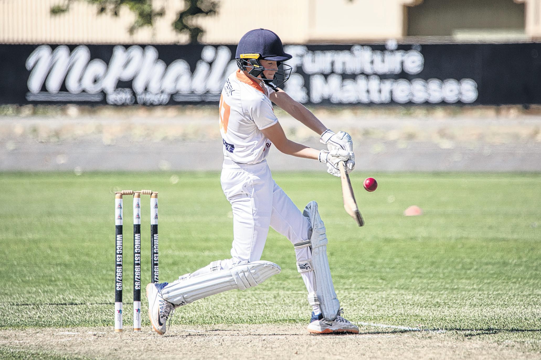HARRIS Bruneau absolutely lays into a wider deliver in Ovens Valley United’s under 14 match with Wangaratta Magpies Black. WDCA scoreboard page 14.