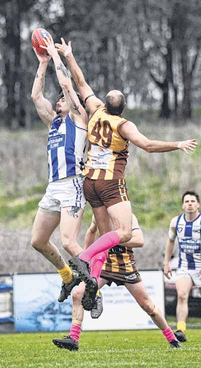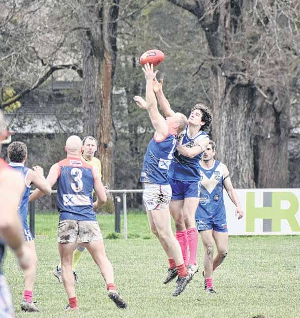 CONTEST: Milawa’s Steve Williamson and Bright’s Joe Gray go up in the ruck. PHOTOS: Charlotte Kilner