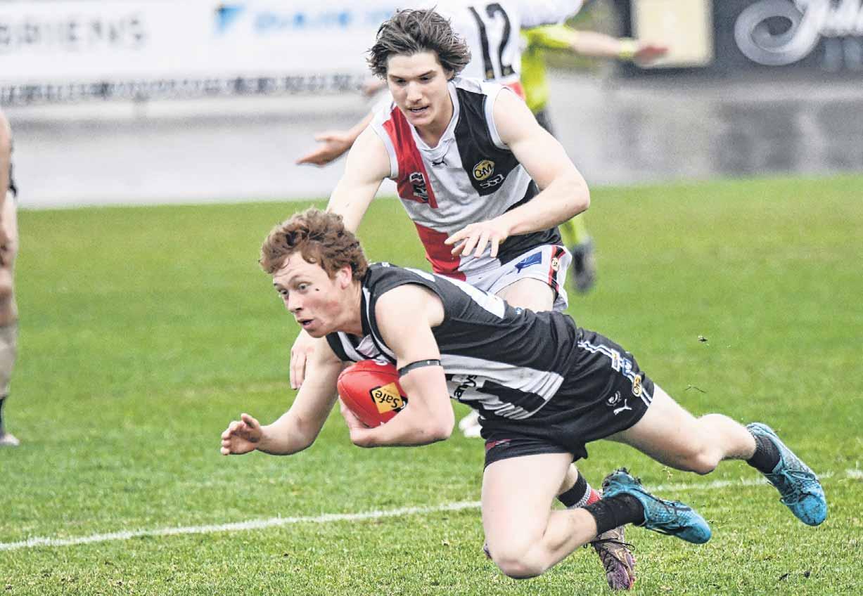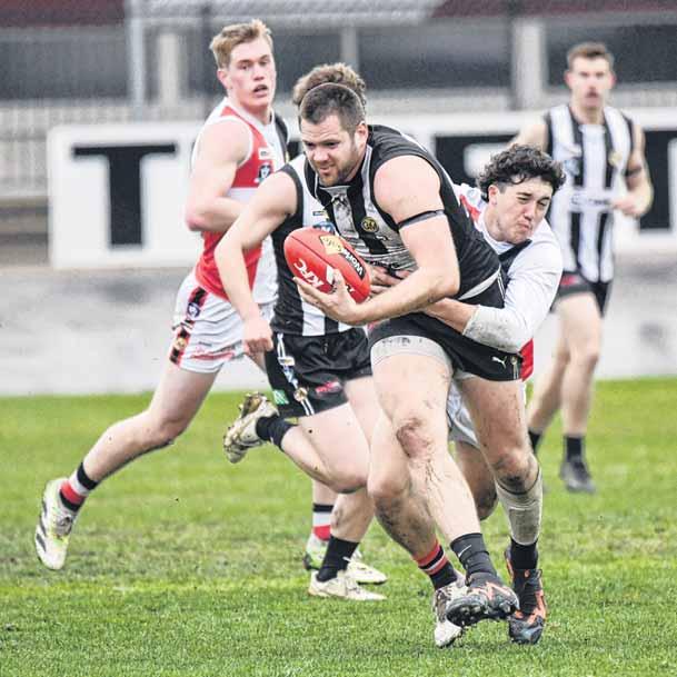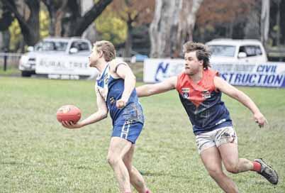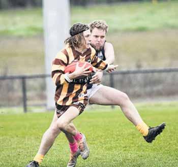 WANGARATTA’S Waitai Tua tries to get away from his Myrtleford opponent but loses his feet in his side’s 117-point win at Norm Minns Oval.