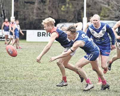 SLIPPED: Riley Bacon evades Callum Honey and dishes a handball out.