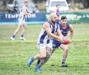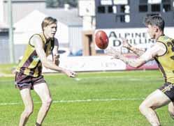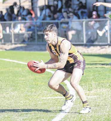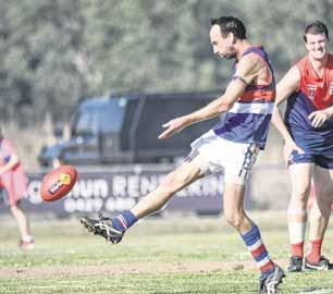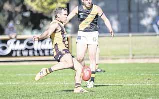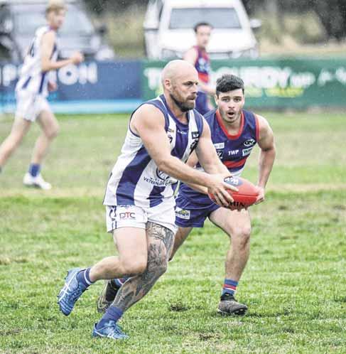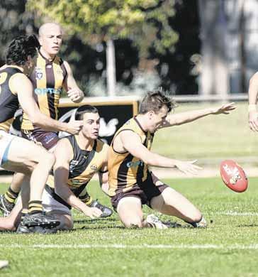 a handball off in his side’s 104-point smashing of Tarrawingee at Milawa Recreation Reserve on Saturday. Story: Page 18 PHOTO: Kurt Hickling