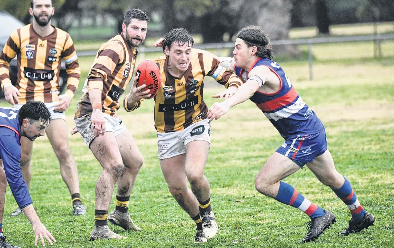 JOSH Nanson goes to fend off Tarrawingee’s Sam Piper in the Hawks’ 27-point win over the Bulldogs, with North Wangaratta booting 17 behinds in the wet.
