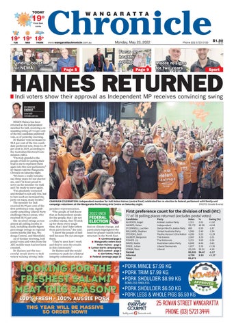 2022 INDI FEDERAL ELECTION tion on climate change, and particularly highlighted the need for greater health infrastructure in the North East. ■ Continued page 2 ■ Wangaratta voters back Helen Haines - page 2 ■ Lyman starts campaigning for 2025 contest - page 3 ■ EDITORIAL PAGE 6 ■ Federal coverage page 10