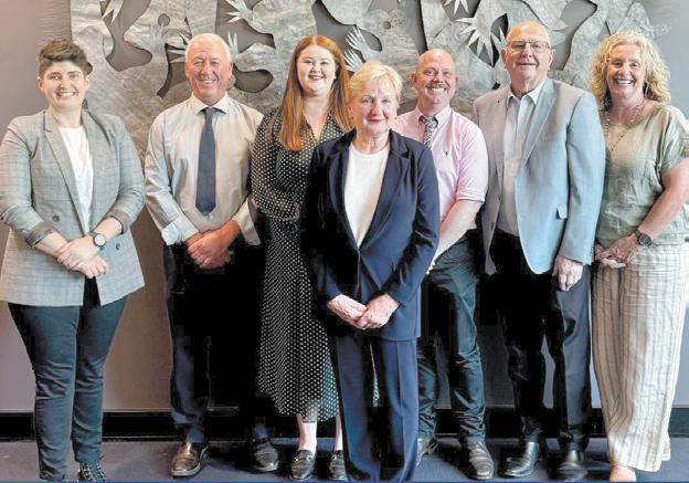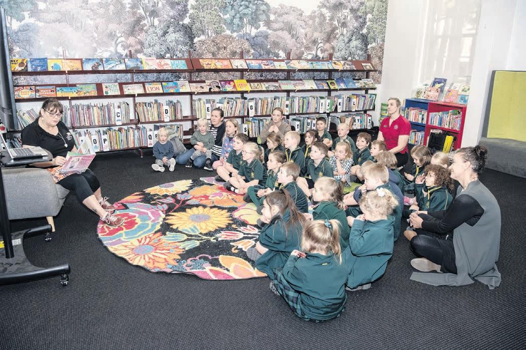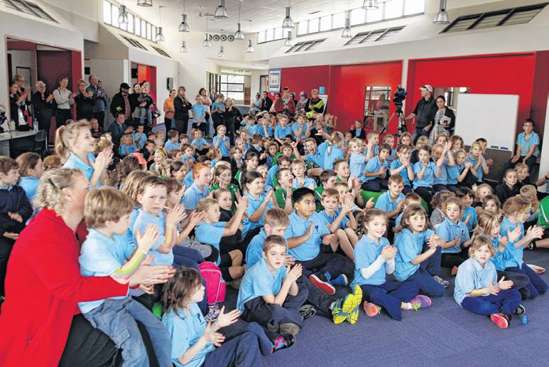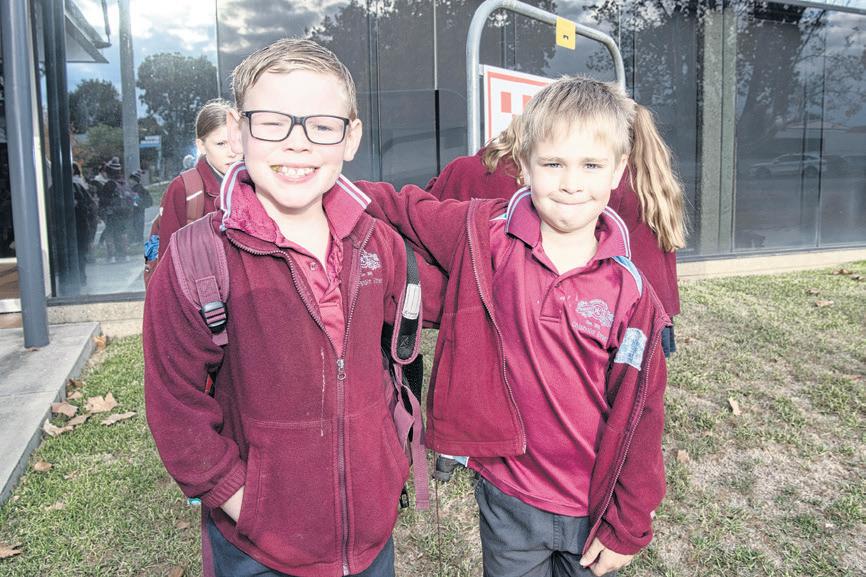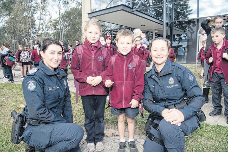 St Patrick’s Primary School students Leon Bright (le ), Nash Hunter, Millie Naish, Ruby Bright and Helena Malcolm teamed up with Senior Constable Hayley McDonald and Wangaratta police for National Walk Safely to School Day. Story page 4