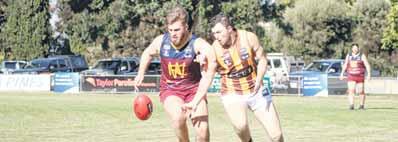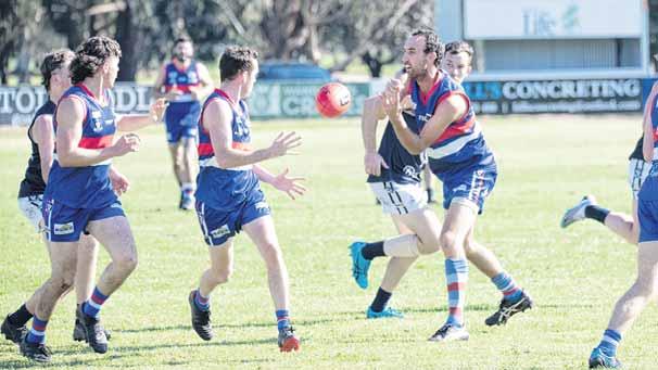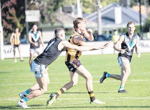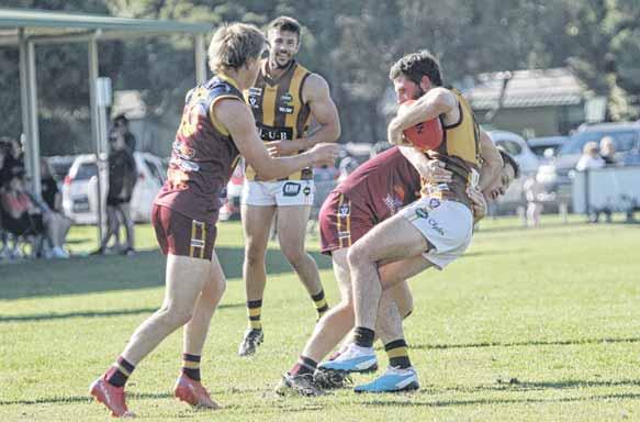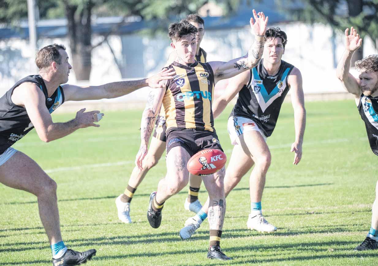 WANGARATTA Rovers midfielder Lockey McCartney is swarmed by Lavington players as he gets a kick away under pressure. Rovers came away with a five point victory.