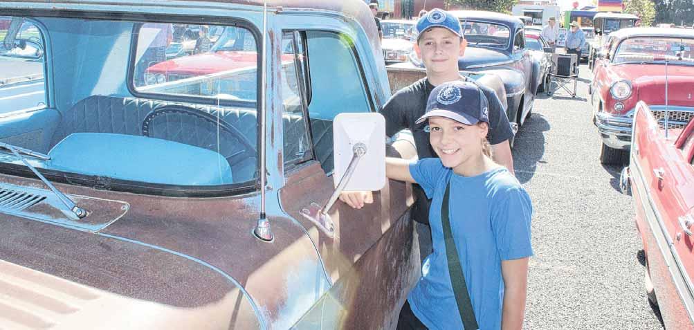 JOURNEY BACK IN TIME: Young friends Georgia Kelly and Will Clark were just two of the thousands of keen motor enthusiasts on Sunday roaming the Wangaratta Airport in the amazing display of vehicles at the fourth bi–annual Wangaratta Historic Motor Show and Fly In. The pair was particularly taken by this 1960s Dodge d100. Full story, photos in Wednesday‘s Chronicle.