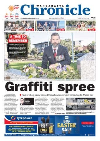 Ph: 5721 8488 A1 Tyrepower Wangaratta Cnr Roy & Norton Streets, Wangaratta LOCALLY OWNED AND OPERATED A1 Tyrepower will provide you with PROFESSIONAL SERVICE AND ADVICE ON ALL YOUR TYRE NEEDS! FIND OUT MORE TERMS & CONDITIONS APPLY. 1ST APRIL - 30TH APRIL 2023 $1.50 INC. GST www.wangarattachronicle.com.au Phone (03) 5723 0100 Monday, April 24, 2023 TODAY xx TUE WED THURS 24 24o 24 24o 24 24o 24 24o Script for social for social connection Page 5 Friends suppor t Friends support Atauro Islander s Islanders Page 11 Hawks snag Hawks snag first win Sport ATTACKED: Vehicles in the Mather Street area were spray painted with offensive language and swastikas as part of a spree in the early hours of Friday morning.