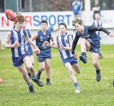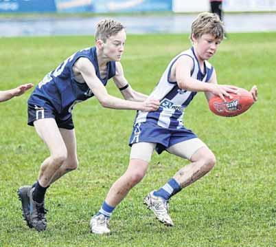 ON THE BOOT: Hudson Wallace looks to get rid of the ball in the under 12 Kangaroos’ semi-final win over College.