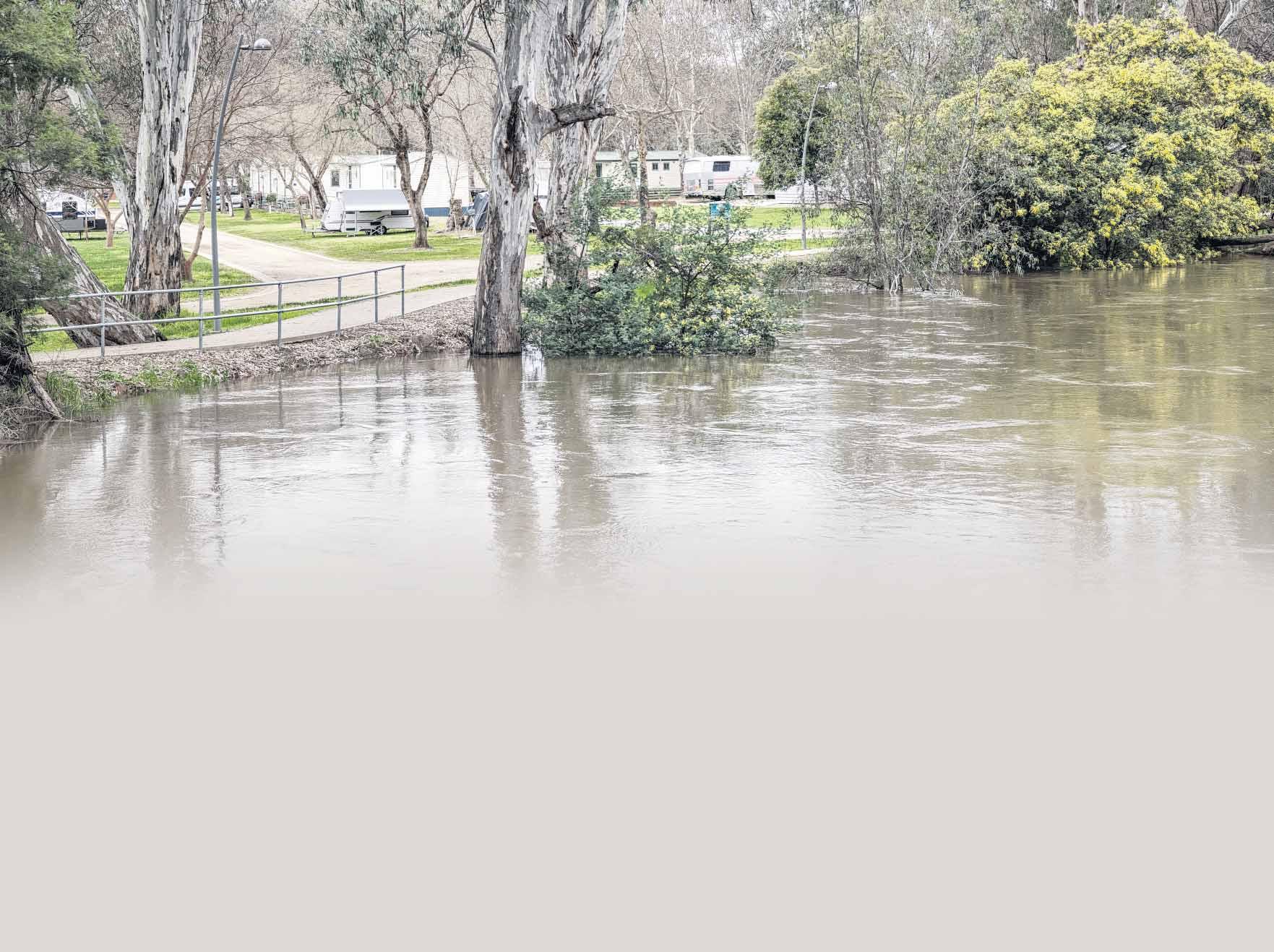 ON THE UP: The Ovens River passed the minor flood level on Sunday afternoon, with an anticipated peak of 12.2m expected OvensFloodwaterstomorrow.fromtheRiveryesterdaywerehighagainsttheBullawahCulturalTrailadjoiningPainter’sIslandCaravanPark.