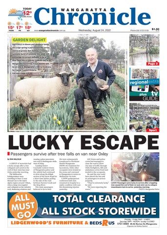 TOTAL CLEARANCE ALL STOCK STOREWIDEMUSTALLGO LIDGERWOOD’S FURNITURE & Monday - Friday: 9AM - 5.30PM Saturday: 9AM - NOON Sunday: CLOSED 5721 6565 40-46 Norton St, Wangaratta (Opposite the Railway Station) $1.50 INC. GSTwww.wangarattachronicle.com.au Phone (03) 5723 0100Wednesday, August 24, 2022 TODAYTODAY Possible shower THURSTHURS FRIFRI SATSAT 1212o 1515o 1717o 1818o