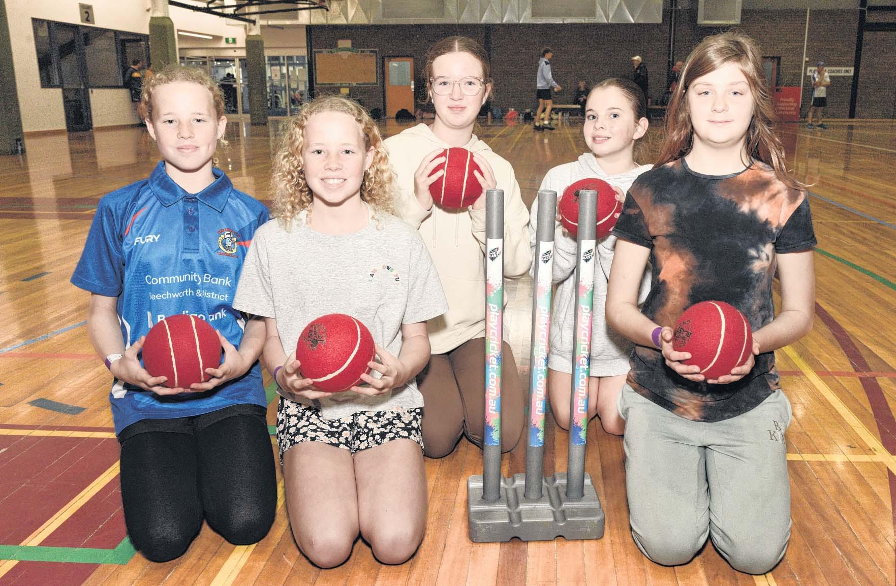 LEXI Richardson, Bridie Burns (back), Emma and Madalyne Shallue and Kiana Fitzpatrick were among a host of juniors who enjoyed the Cricket Carnival for Girls on Wednesday at Wangaratta. Story: Page 41