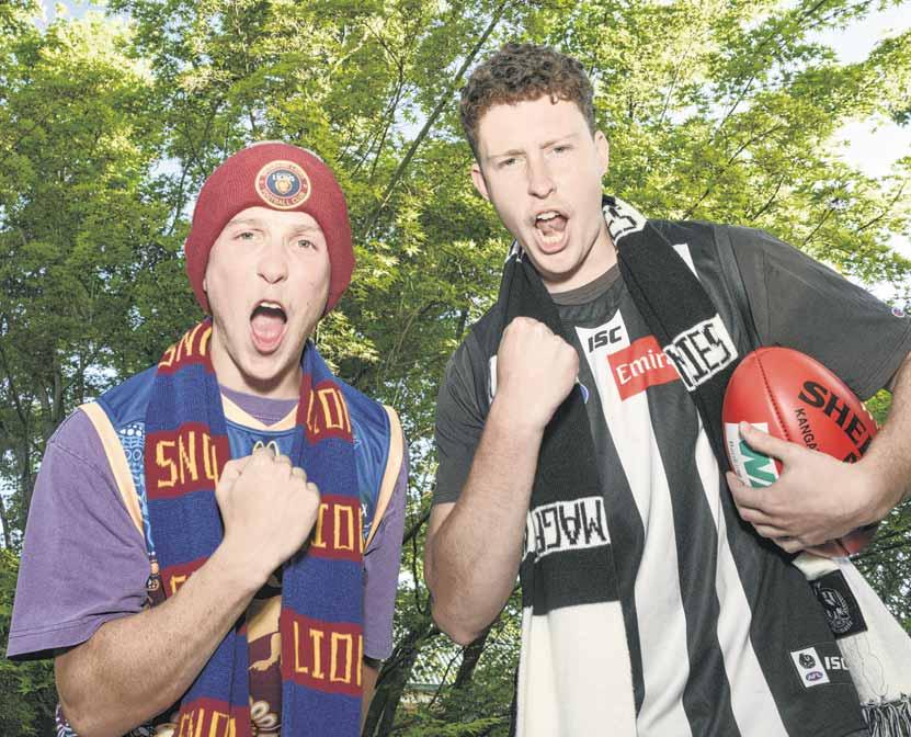 BEST mates Dylan Shepard (left) and Harry Verdon will be locking horns tomorrow as Dylan’s Lions and Harry’s Magpies battle it out for the AFL premiership, where no mercy in vocal barbs and boasting to be shared upon the loser.