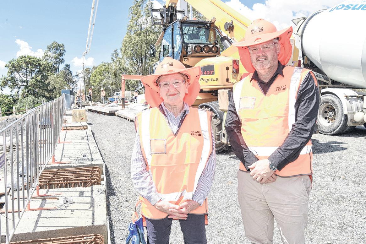 NEAR COMPLETION: Wangaratta Mayor Irene Grant with Inland Rail delivery director B2A, Ed Walker, with the Green Street Bridge in the background.