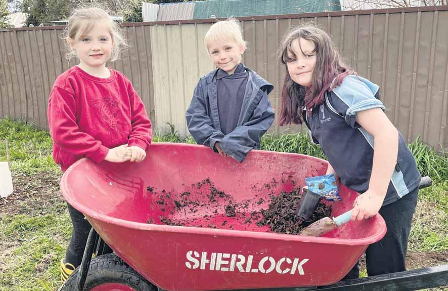 GREAT OUTDOORS: Mackenzie Bartlome, Kaden Hines and Peyton Jessup are among the students who have been helping plant native species to improve the habitat at Yarrunga Primary School. PHOTO: Belinda Harrison COMMUNITY INVITED TO DIG DEEP YARRUNGA’SFORGARDEN