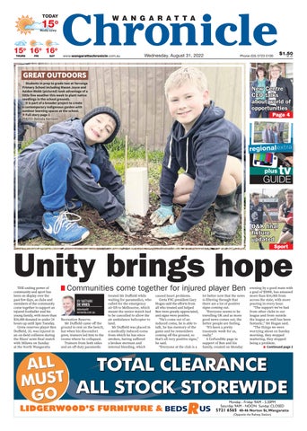 TOTAL CLEARANCE ALL STOCK STOREWIDEMUSTALLGO LIDGERWOOD’S FURNITURE & Monday - Friday: 9AM - 5.30PM Saturday: 9AM - NOON Sunday: CLOSED 5721 6565 40-46 Norton St, Wangaratta (Opposite the Railway Station) $1.50 INC. GSTwww.wangarattachronicle.com.au Phone (03) 5723 0100Wednesday, August 31, 2022 TODAY Mostly sunny sunny THURSTHURS FRIFRI SATSAT 15 15o 15 15o 16 16o 16 16o Communities come together for injured player BenC i i g h f i j d pl y B Unity brings hopePage4 New Centre CEO talks about wor ld ofworld oppor opportunitiestunities tv GUIDE plus Sport O & K f i n a lO&K final f i x t u r ufixtureepdate updatedd
