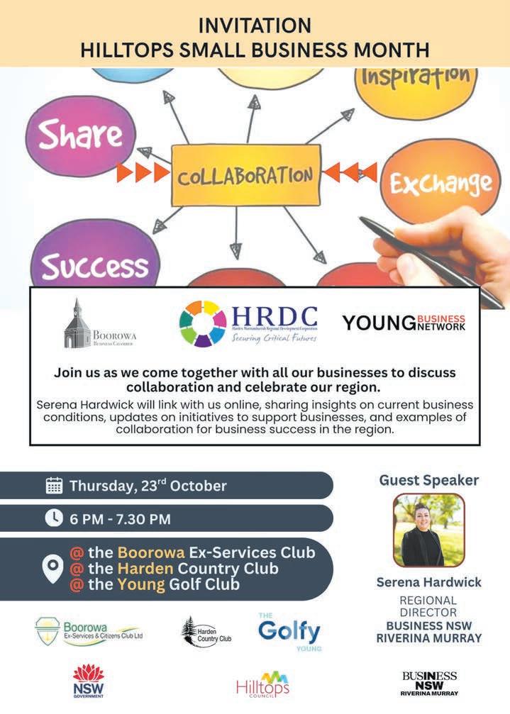 The business network chambers of Boorowa, Harden and Young are proud to announce their participation in NSW Small Business Month 2025, presenting a unique collaborative online event on Thursday, 23rd October from 6pm.