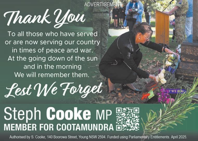 In the local area on Friday services will be held at Bendick Murrell, Bribbaree, Crowther, Koorawatha, Wirrimah, Monteagle, Murringo and Young. See inside for service and commemoration times.