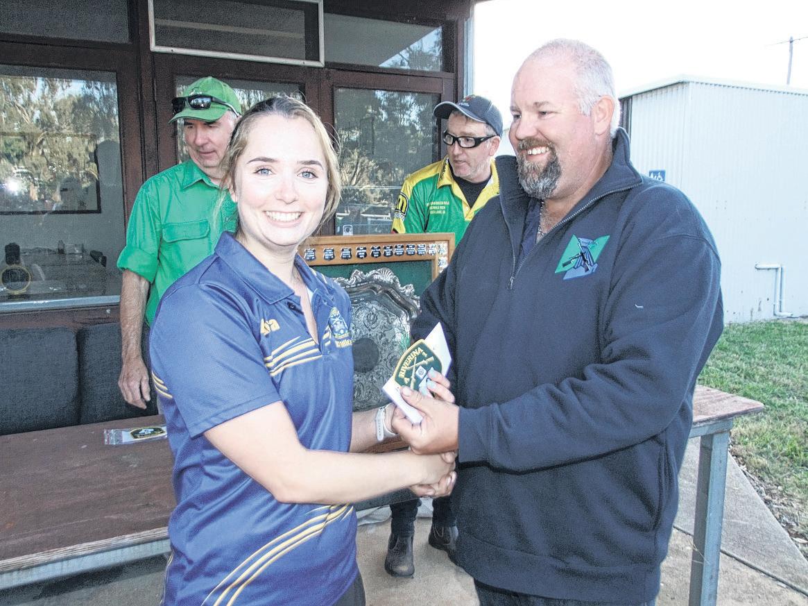 LAURA BRINDLEY PRESENTED WITH HER TROPHY BY RIVERINA PRESIDENT KEVIN PATON. PHOTO: SUPPLIED
