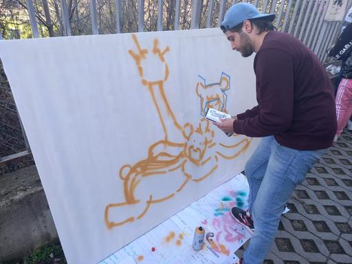 Day 5 (Friday) On our fifth day, Kiril Stoilov, a famous graffiti artist from Blagoevgrad, was invited to our work session of the day. After telling us a bit about himself and his art, he divided us into teams and asked us to think of ideas for graffiti paintings related to cyberbullying, hate speech and human rights. We then went on to give shape and form to our ideas on 2 metre wide canvases, using graffiti sprays and the invaluable help and suggestions of our special guest.
