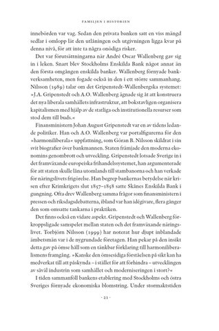 innebörden var vag. Sedan den privata banken satt en viss mängd sedlar i omlopp lät den utlåningen och utgivningen ligga kvar på denna nivå, för att inte ta några onödiga risker. Det var förutsättningarna när André Oscar Wallenberg gav sig in i leken. Snart blev Stockholms Enskilda Bank något annat än den första omgången enskilda banker. Wallenberg förnyade bankverksamheten, men fogade också in den i ett större sammanhang. Nilsson (1989) talar om det Gripenstedt-Wallenbergska systemet: »J.A. Gripenstedt och A.O. Wallenberg ägnade sig åt att konstruera det nya liberala samhällets infrastruktur, att bokstavligen organisera kapitalismen med hjälp av de statliga och institutionella resurser som stod dem till buds.« Finansministern Johan August Gripenstedt var en av tidens ledande politiker. Han och A.O. Wallenberg var portalfigurerna för den »harmoniliberala« uppfattning, som Göran B. Nilsson skildrat i sin svit biografier över bankmannen. Staten främjade den moderna ekonomins genombrott och utveckling. Gripenstedt lotsade Sverige in i det framväxande europeiska frihandelssystemet, han argumenterade för att staten skulle låna utomlands till stambanorna och han verkade för näringslivets frigörelse. Han begrep bankernas betydelse när krisen efter Krimkrigets slut 1857–1858 satte Skånes Enskilda Bank i gungning. Ofta drev Wallenberg samma frågor som finansministern i pressen och riksdagsdebatterna, ibland var han idégivare, flera gånger den som omsatte tankarna i praktiken. Det finns också en vidare aspekt. Gripenstedt och Wallenberg förkroppsligade samspelet mellan staten och det framväxande näringslivet. Torbjörn Nilsson (1999) har noterat hur djupt inblandade ämbetsmän var i de nygrundade företagen. Han pekar på den insikt detta gav på ömse håll som en tänkbar förklaring till harmoniliberalismens framgång. »Kanske den ömsesidiga förståelsen på sikt kan ha medverkat till att påskynda – i stället för att förhindra – utvecklingen av såväl industrin som samhället och moderniseringen i stort?« I tiden sammanföll bankens etablering med Stockholms och östra Sveriges förnyade ekonomiska blomstring. Under stormaktstiden · 21 ·