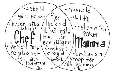 här men det skakar hon av sig. Egentligen är väl chef och mamma samma sak? När hon går nerför korridoren gör hon en tankekarta över olikheter och skillnader mellan hennes två identiteter.