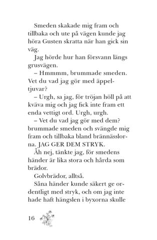 Smeden skakade mig fram och tillbaka och ute på vägen kunde jag höra Gusten skratta när han gick sin väg. Jag hörde hur han försvann längs grusvägen. – Hmmmm, brummade smeden. Vet du vad jag gör med äppel tjuvar? – Urgh, sa jag, för tröjan höll på att kväva mig och jag fick inte fram ett enda vettigt ord. Urgh, urgh. – Vet du vad jag gör med dem? brummade smeden och svängde mig fram och tillbaka bland brännässlorna. JAG GER DEM STRYK. Åh nej, tänkte jag, för smedens händer är lika stora och hårda som brädor. Golvbrädor, alltså. Såna händer kunde säkert ge ordentligt med stryk, och om jag inte hade haft hängslen i byxorna skulle 16