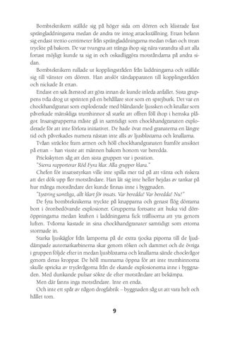 Bombteknikern ställde sig på höger sida om dörren och klistrade fast sprängladdningarna medan de andra tre intog attackställning. Ettan befann sig endast trettio centimeter från sprängladdningarna medan tvåan och trean tryckte på bakom. De var tvungna att tränga ihop sig nära varandra så att alla fortast möjligt kunde ta sig in och oskadliggöra motståndarna på andra sidan. Bombteknikern rullade ut kopplingstråden från laddningarna och ställde sig till vänster om dörren. Han anslöt tändapparaten till kopplingstråden och nickade åt ettan. Endast en sak återstod att göra innan de kunde inleda anfallet. Sista gruppens tvåa drog ut sprinten på en behållare stor som en sprejburk. Det var en chockhandgranat som exploderade med bländande ljussken och knallar som påverkade mänskliga trumhinnor så starkt att offren föll ihop i hemska plågor. Insatsgrupperna måste gå in samtidigt som chockhandgranaten exploderade för att inte förlora initiativet. De hade övat med granaterna en längre tid och påverkades numera nästan inte alls av ljusblixtarna och knallarna. Tvåan sträckte fram armen och höll chockhandgranaten framför ansiktet på ettan – han visste att männen bakom honom var beredda. Prickskytten såg att den sista gruppen var i position. ”Sierra rapporterar Röd Fyra klar. Alla grupper klara.” Chefen för insatsstyrkan ville inte spilla mer tid på att vänta och riskera att det dök upp fler motståndare. Han lät sig inte heller hejdas av tankar på hur många motståndare det kunde finnas inne i byggnaden. ”Lystring samtliga, allt klart för insats. Var beredda! Var beredda! Nu!” De fyra bombteknikerna tryckte på knapparna och genast flög dörrarna bort i öronbedövande explosioner. Grupperna fortsatte att huka vid dörröppningarna medan kraften i laddningarna fick träflisorna att yra genom luften. Tvåorna kastade in sina chockhandgranater samtidigt som ettorna stormade in. Starka ljuskäglor från lamporna på de extra tjocka piporna till de ljuddämpade automatkarbinerna skar genom röken och dammet och de övriga i gruppen följde efter in medan ljusblixtarna och knallarna sände chockvågor genom deras kroppar. De höll munnarna öppna för att inte trumhinnorna skulle spricka av tryckvågorna från de ekande explosionerna inne i byggnaden. Med dunkande pulsar sökte de efter motståndare att bekämpa. Men där fanns inga motståndare. Inte en enda. Och inte ett spår av någon drogfabrik – byggnaden såg ut att vara helt och hållet tom. 9