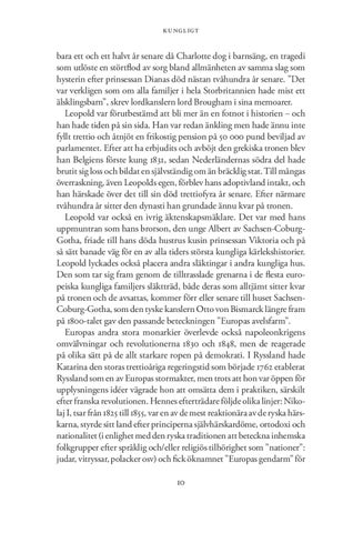 bara ett och ett halvt år senare då Charlotte dog i barnsäng, en tragedi som utlöste en störtflod av sorg bland allmänheten av samma slag som hysterin efter prinsessan Dianas död nästan tvåhundra år senare. ”Det var verkligen som om alla familjer i hela Storbritannien hade mist ett älsklingsbarn”, skrev lordkanslern lord Brougham i sina memoarer. Leopold var förutbestämd att bli mer än en fotnot i historien – och han hade tiden på sin sida. Han var redan änkling men hade ännu inte fyllt trettio och åtnjöt en frikostig pension på 50 000 pund beviljad av parlamentet. Efter att ha erbjudits och avböjt den grekiska tronen blev han Belgiens förste kung 1831, sedan Nederländernas södra del hade brutit sig loss och bildat en självständig om än bräcklig stat. Till mångas överraskning, även Leopolds egen, förblev hans adoptivland intakt, och han härskade över det till sin död trettiofyra år senare. Efter närmare tvåhundra år sitter den dynasti han grundade ännu kvar på tronen. Leopold var också en ivrig äktenskapsmäklare. Det var med hans uppmuntran som hans brorson, den unge Albert av Sachsen-CoburgGotha, friade till hans döda hustrus kusin prinsessan Viktoria och på så sätt banade väg för en av alla tiders största kungliga kärlekshistorier. Leopold lyckades också placera andra släktingar i andra kungliga hus. Den som tar sig fram genom de tilltrasslade grenarna i de flesta europeiska kungliga familjers släktträd, både deras som alltjämt sitter kvar på tronen och de avsattas, kommer förr eller senare till huset SachsenCoburg-Gotha, som den tyske kanslern Otto von Bismarck längre fram på 1800-talet gav den passande beteckningen ”Europas avelsfarm”. Europas andra stora monarkier överlevde också napoleonkrigens omvälvningar och revolutionerna 1830 och 1848, men de reagerade på olika sätt på de allt starkare ropen på demokrati. I Ryssland hade Katarina den storas trettioåriga regeringstid som började 1762 etablerat Ryssland som en av Europas stormakter, men trots att hon var öppen för upplysningens idéer vägrade hon att omsätta dem i praktiken, särskilt efter franska revolutionen. Hennes efterträdare följde olika linjer: Nikolaj I, tsar från 1825 till 1855, var en av de mest reaktionära av de ryska härskarna, styrde sitt land efter principerna självhärskardöme, ortodoxi och nationalitet (i enlighet med den ryska traditionen att beteckna inhemska folkgrupper efter språklig och/eller religiös tilhörighet som ”nationer”: judar, vitryssar, polacker osv) och fick öknamnet ”Europas gendarm” för 10