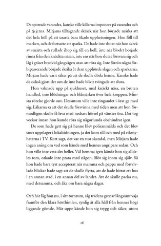 De sporrade varandra, kanske ville killarna imponera på varandra och på tjejerna. Mirjams tilltagande skräck när hon började märka att det hela höll på att urarta bara ökade upphetsningen. Hon föll till marken, och de fortsatte att sparka. De hade inte slutat när hon skrek av smärta och rullade ihop sig till en boll, inte när blodet började rinna från den knäckta näsan, inte ens när hon slutat försvara sig och låg i gräset bredvid gångvägen utan att röra sig. Inte förrän några förbipasserande började skrika åt dem upphörde slagen och sparkarna. Mirjam hade varit säker på att de skulle döda henne. Kanske hade de också gjort det om de inte hade blivit tvingade att sluta. Hon vaknade upp på sjukhuset, med knäckt näsa, en bruten handled, inre blödningar och blåmärken över hela kroppen. Minsta rörelse gjorde ont. Dessutom ville inte ringandet i örat ge med sig. Läkarna sa att det skulle försvinna med tiden men att hon förmodligen skulle få leva med nedsatt hörsel på vänster öra. Det tog veckor innan hon kunde röra sig någorlunda obehindrat igen. De som hade gett sig på henne blev polisanmälda och det blev stort uppslaget i lokaltidningen, ja det kom till och med på riksnyheterna i TV. Kort sagt, det var en stor skandal, men Mirjam hade ingen aning om vad som hände med hennes angripare sedan. Och hon ville inte veta det heller. Väl hemma igen kände hon sig alldeles tom, orkade inte prata med någon. Slöt sig inom sig själv. Så hon hade bara tyst accepterat när mamma och pappa med förtvivlade blickar hade sagt att de skulle flytta, att de hade hittat ett hus i en annan stad, i en annan del av landet. Att de skulle packa nu, med detsamma, och åka om bara några dagar. Och här låg hon nu, i sitt tornrum, såg trädens grenar långsamt vaja framför den klara hösthimlen, synlig åt alla håll från hennes högt liggande gömsle. Här uppe kände hon sig trygg och säker, utom