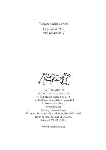 KÄRLEKSAKUTEN © Text: Marie Oskarsson, 2012 © Bild: Helena Bergendahl, 2012 Omslagsformgivning: Helena Bergendahl Redaktör: Sofia Hannar Typsnitt: Sabon Sättning: Ellen Adolfsson Utgiven av Bonnier Carlsen Bokförlag, Stockholm, 2012 Tryckt av ScandBook AB i Falun 2012 ISBN 978-91-638-7216-7 www.bonniercarlsen.se