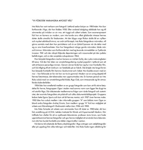 Inta Ruka har varit verksam som fotograf i Lettland sedan början av 1980-talet. Hon bor fortfarande i Riga, där hon föddes 1958. Efter avslutad skolgång utbildade hon sig till sömmerska på inrådan av sin mor, ett tryggt och säkert arbete. Som examenspresent fick hon en kamera av modern, som inte kunde ana vilket glödande intresse hennes dotter skulle utveckla för fotokonsten. Att den blyga unga flickan skulle bli en nyfiken och mycket utåtriktad kvinna, var svårt att förutspå. Inta Ruka fotograferar människor, vill gärna samtala med dem hon porträtterar och är en lyhörd lyssnare när de delar med sig av sina livserfarenheter. Hon har fotograferat många gamla människor, både män och kvinnor. Människor som fortfarande bär med sig levande minnesbilder av Tysklands invasion 1941 och den därpå följande deporteringen och massmordet på den judiska befolkningen, och av den sovjetiska ockupationen 1944. Hon började fotografera med en kamera av märket Zorkij, den ryska motsvarigheten till Leica. Vid den här tiden var amatörfotografering mycket populärt i Lettland som ett sätt att bevara personliga minnen. Genom vänner lärde hon sig hur man framkallar film, och fick tillgång till ett mörkrum i en fotoklubb på en fabrik. Det dröjde inte länge förrän hon började framkalla film hemma i badrummet och i köket. Hon bodde ensam med sin mor – hon förlorade sin far när hon var tio år gammal. Modern var en aning skeptisk till hennes fotointresse, det tolererades men uppmuntrades inte. En kortare period var Inta Ruka också med i en amatörfotografisk klubb, Riga Club, som intresserade sig för atmosfäriska kalenderbilder. 1984 blev hon emellertid medlem av en grupp fotografer som kom att få större betydelse för henne, fotogruppen Ogre i staden med samma namn som ligger lite drygt tre mil utanför Riga. Där diskuterade medlemmarna frågor som rörde fotografi och autenticitet, det svartvita fotografiets uttryckskraft och olika dokumentärbildsprojekt. Gruppens ledare hette Egons Spuris och kom att bli hennes mentor, och 1987 även hennes make. 1985 blev hon också medlem i den informella gruppen ”A” som bildats inom Ogre av bland andra fotografen Andrej Grants. Som medlem i grupp ”A” fick hon möjlighet att arbeta som frilansfotograf i Vladivostok mellan åren 1986 och 1988. Inta Ruka fortsatte att arbeta som sömmerska fram till slutet av 1980-talet, då hon fick anställning på LICEM, Lettiska Institutet för Klinisk och Experimentell Medicin. Där träffade hon chefen för ett av sjukhusets laboratorier, professor Janis Linars, som hade uppmärksammat hennes fotografier och gav henne möjlighet att använda hans laboratorium där hon kunde framkalla sina bilder några kvällar i veckan. Vid denna tid arbetade de flesta yrkesfotografer i Riga antingen som ateljéfotografer eller på uppdrag från olika tidningar och tidskrifter. Inta Ruka hade ingen utbildning för