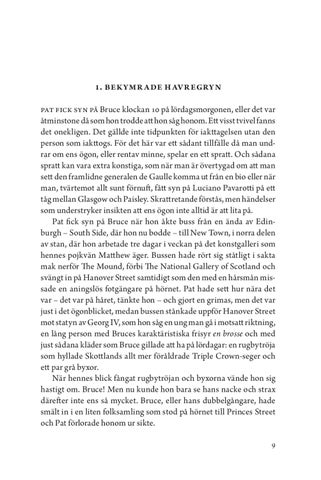 1. Bekymrade havregryn Pat fick syn på Bruce klockan 10 på lördagsmorgonen, eller det var åtminstone då som hon trodde att hon såg honom. Ett visst tvivel fanns det onekligen. Det gällde inte tidpunkten för iakttagelsen utan den person som iakttogs. För det här var ett sådant tillfälle då man undrar om ens ögon, eller rentav minne, spelar en ett spratt. Och sådana spratt kan vara extra konstiga, som när man är övertygad om att man sett den framlidne generalen de Gaulle komma ut från en bio eller när man, tvärtemot allt sunt förnuft, fått syn på Luciano Pavarotti på ett tåg mellan Glasgow och Paisley. Skrattretande förstås, men händelser som understryker insikten att ens ögon inte alltid är att lita på. Pat fick syn på Bruce när hon åkte buss från en ända av Edinburgh – South Side, där hon nu bodde – till New Town, i norra delen av stan, där hon arbetade tre dagar i veckan på det konstgalleri som hennes pojkvän Matthew äger. Bussen hade rört sig ståtligt i sakta mak nerför The Mound, förbi The National Gallery of Scotland och svängt in på Hanover Street samtidigt som den med en hårsmån missade en aningslös fotgängare på hörnet. Pat hade sett hur nära det var – det var på håret, tänkte hon – och gjort en grimas, men det var just i det ögonblicket, medan bussen stånkade uppför Hanover Street mot statyn av Georg IV, som hon såg en ung man gå i motsatt riktning, en lång person med Bruces karaktäristiska frisyr en brosse och med just sådana kläder som Bruce gillade att ha på lördagar: en rugbytröja som hyllade Skottlands allt mer föråldrade Triple Crown-seger och ett par grå byxor. När hennes blick fångat rugbytröjan och byxorna vände hon sig hastigt om. Bruce! Men nu kunde hon bara se hans nacke och strax därefter inte ens så mycket. Bruce, eller hans dubbelgångare, hade smält in i en liten folksamling som stod på hörnet till Princes Street och Pat förlorade honom ur sikte. 9