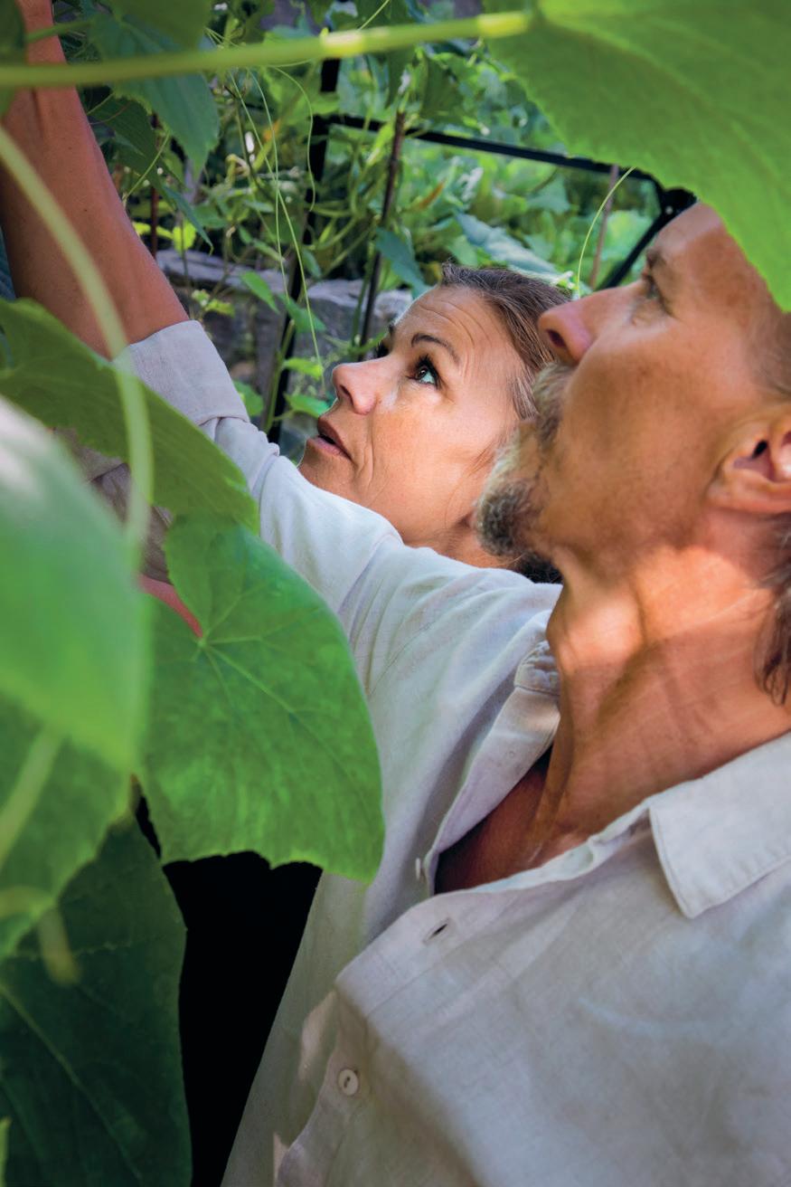Under arbetet med boken har vi verkligen nördat ner oss i vårt potatisland, våra tomatkrukor, vårt jordärtskockstrassel och sett livet i allihop, gjort årsresan tillsammans med dem. Vi har sått och planterat, pysslat om och jagat skadeinsekter. (Huva! Där har vi mycket att lära.) Och så har vi skördat och lagat.